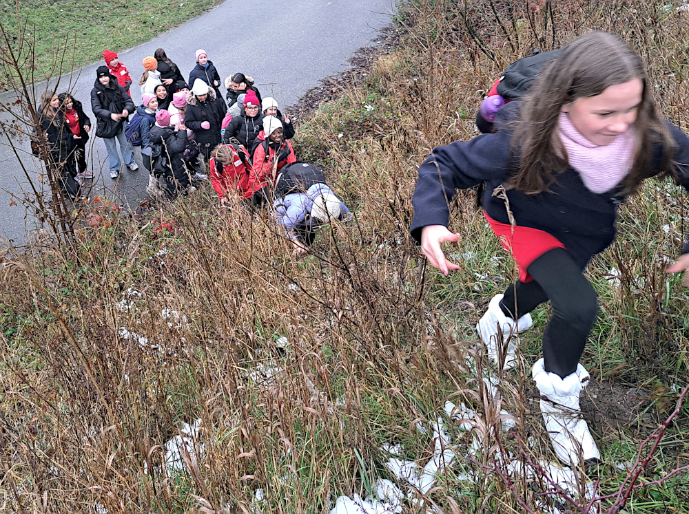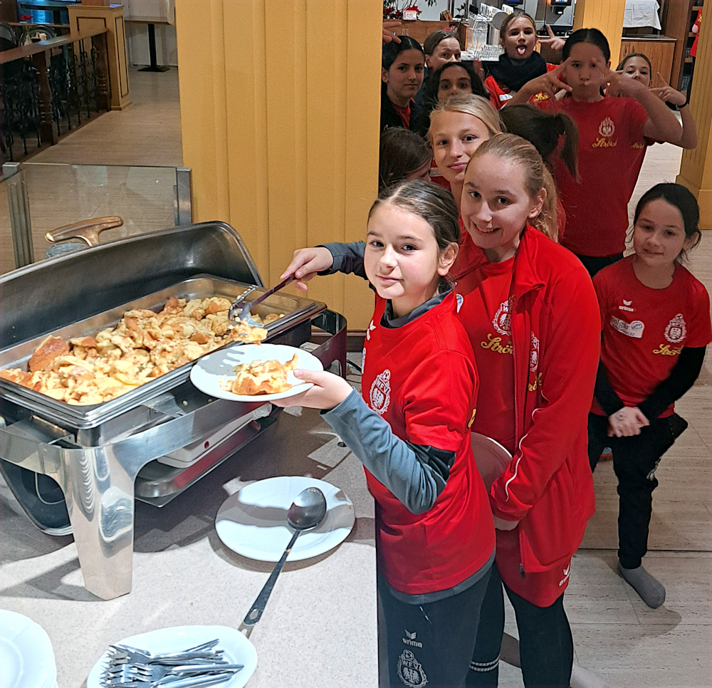 Die Kooperationsschule des WFV (Wiener Fußballverband) war mit insgesamt 25 Schülerinnen vor Ort. Der Weg dorthin dauerte, doch die Polgargirls hatten immer einen breiten Grinser im Gesicht. Zuerst war die Bahnfahrt, dann ging es vom Bahnhof Spillern zu Fuß weiter, ein Abschneider inklusive – über eine Böschung – dann fanden die Mädels eine angefrorene Lacke, wo sie die Eisschicht vorsichtig lösten und eine Zeit mittransportierten, danach wurde kurz gesprintet, bis sie endlich in der Kaiserrast angekommen waren.