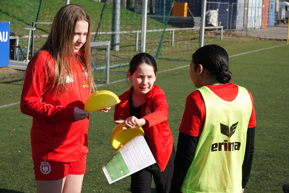 Da eine Spielerin verletzt war, übernahm sie gleich die Co-Trainer-Rolle und leitete die ersten Übungen an. Safiya Mayrabekowa führte souverän durch die Trainingseinheit, da staunte selbst Frisu nicht schlecht: „Wenn sie keine Fußballerin wird, ist ihr ein erfolgreicher Trainerjob sichergestellt.“