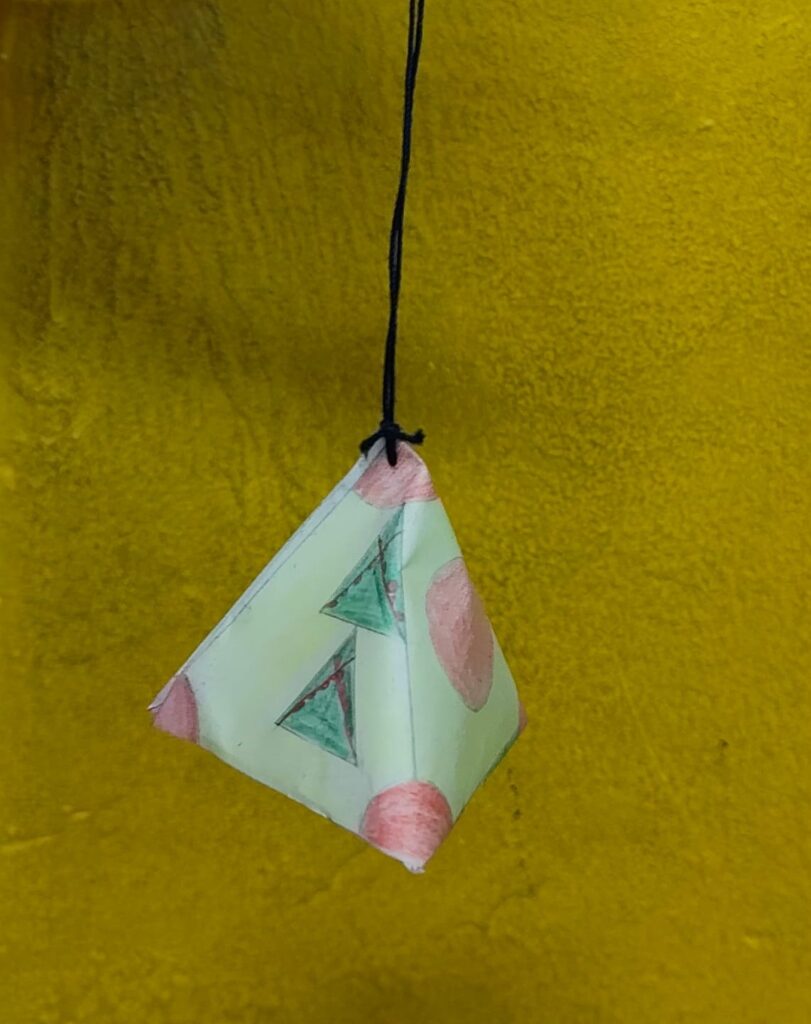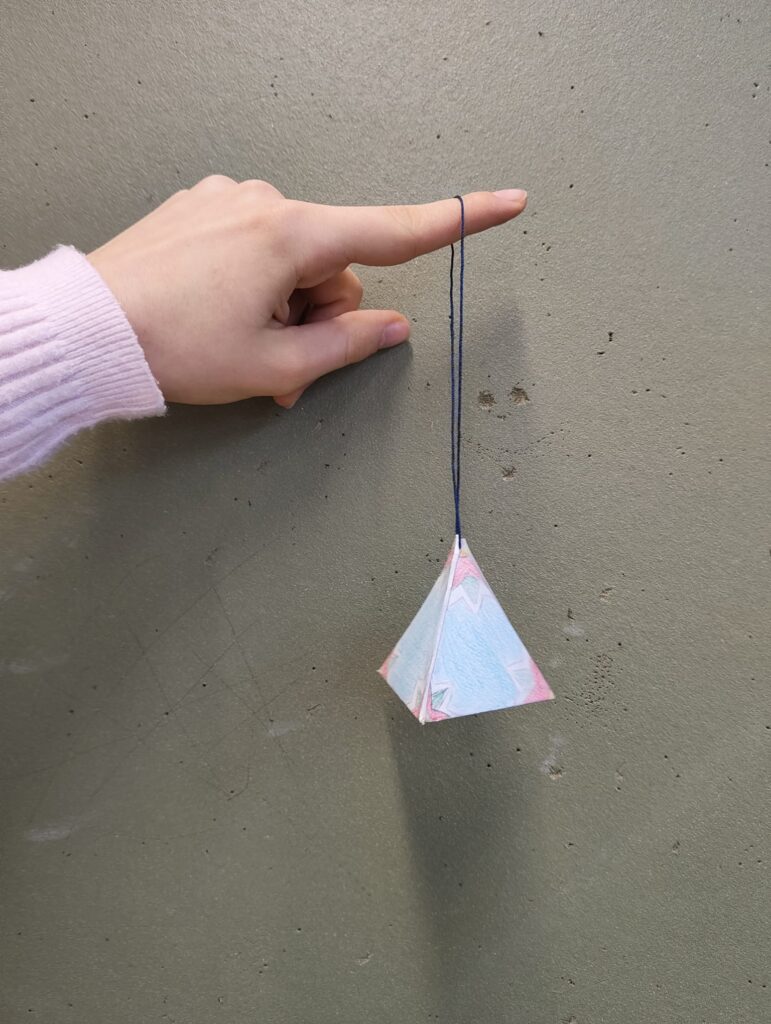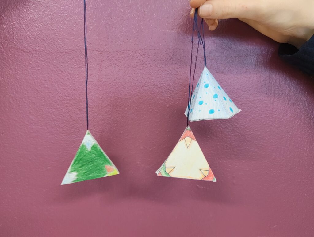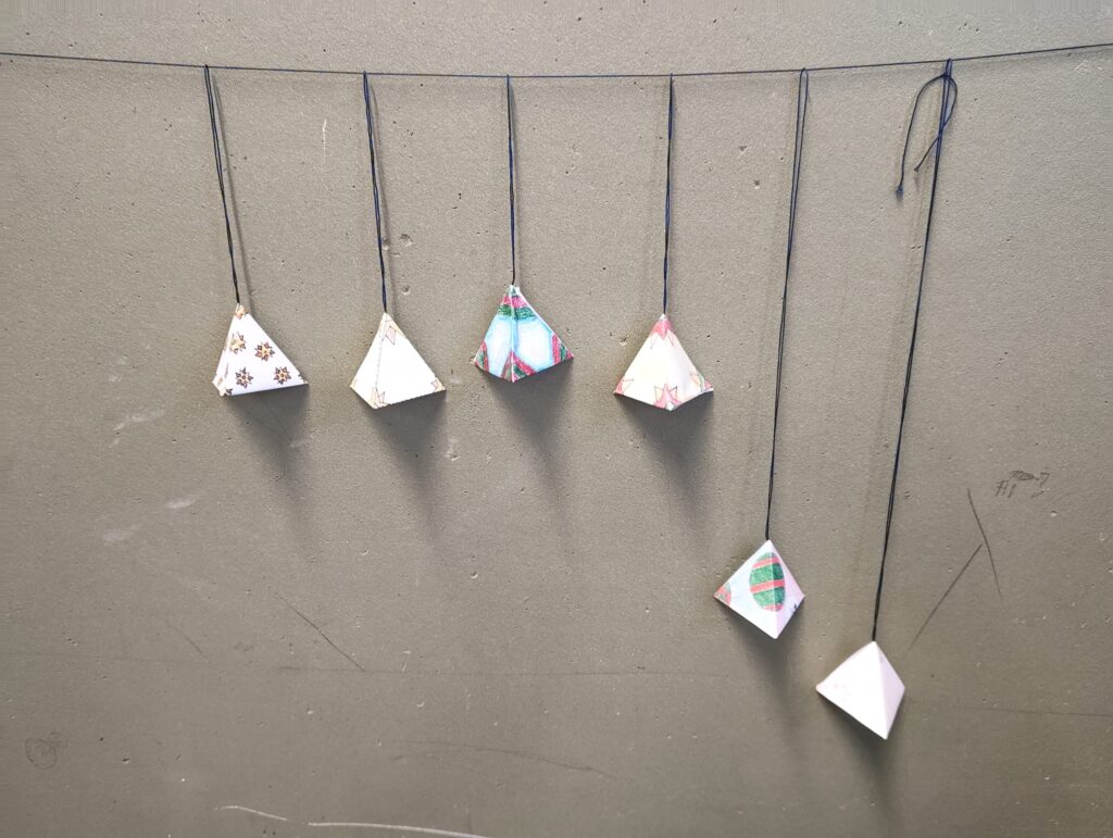 Zuerst wurden mit Geodreieck und Zirkel Tetraedernetze konstruiert. Anschließend wurden diese mit Laschen versehen (zum Zusammenkleben) und die Netze angemalt. Danach wurden die Netze inkl. Laschen ausgeschnitten und dann mit einem Faden in der Mitte zusammengeklebt.